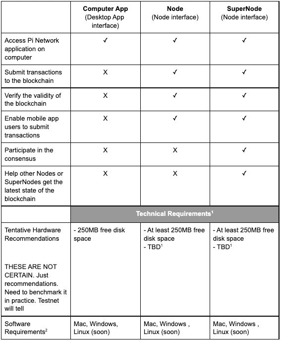 下表概述了 Pi Node 软件的三个参与级别,以及每个参与级别对计算机的硬件和软件要求。